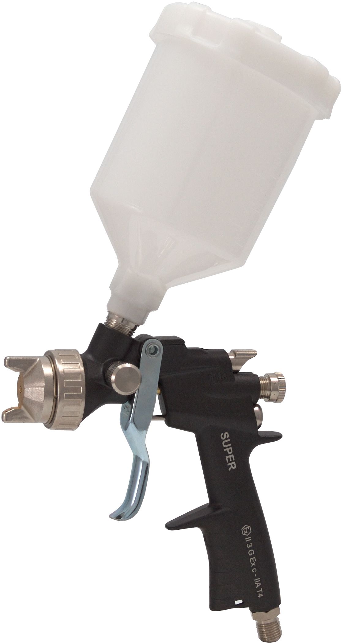 Yleiskäyttöön liuotinpohjaisille maaleille soveltuva yläsäiliömaaliruisku. Laaja toiminta-alue, painealue 1 - 4 baria. Ilmankulutus 150 - 400 l/min paineesta riippuen. Pikapaineenalennin.
