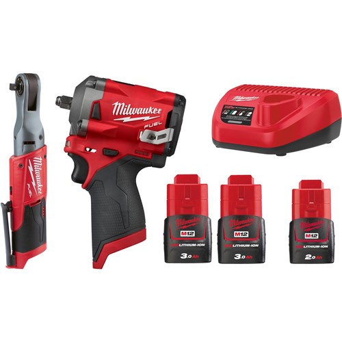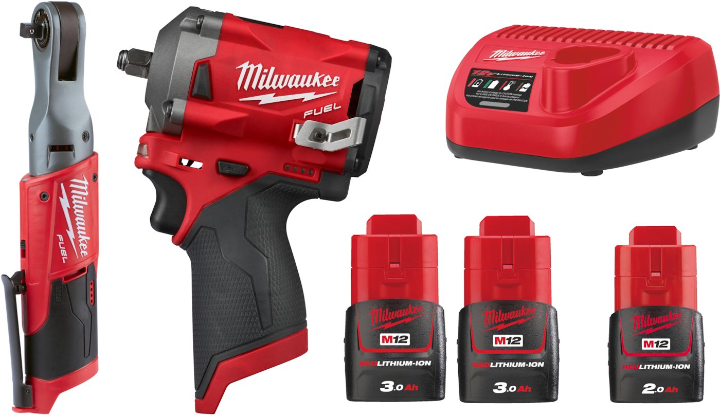Milwaukee M12 Fuel™ konepaketti 3/8", mutterinväännin 339 Nm, räikkä 75 Nm + 3 x 3 Ah