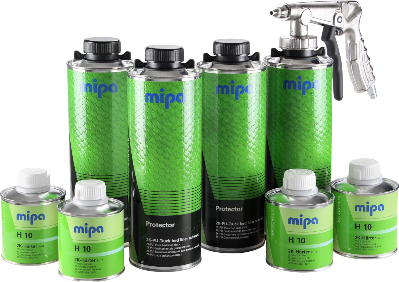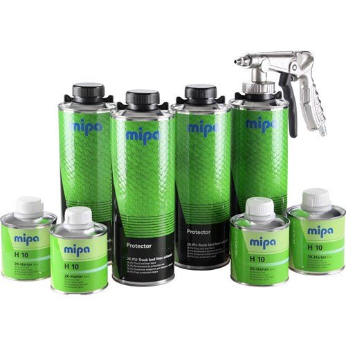 Mipa 2K PU pintamaali Protector setti on tarkoitettu erittäin kovaa kulutusta tarvitseviin pintoihin. Soveltuu avolava-autojen lavojen suojapinnoitukseen sekä erilaisiin lastauspintoihin ja lattioihin tavarakuljetuslaitteissa, alustoihin, runkoihin, tavaratiloihin, astinlautoihin, kansiin niin ajoneuvoissa, teollisuudessa, veneissä kuin muissakin kulutusta vaativissa pinnoissa. Soveltuu myös äänieristystä tarvitseviin kohteisiin. Kestää lämpöä 150 astetta, hetkellisesti jopa 180 astetta. Soveltuu teräs-, sinkki-, alumiini-, puu- sekä lasikuitupinnoille. Sekoitussuhde Mipa H10 ja H5 kovettajilla 3:1 tilavuussuhteessa tai 4:1 painosuhteessa. Käyttövalmis kovetteen lisäyksen jälkeen, erillistä ohennetta ei tarvita. Setissä 4 x 750 ml Protector ja 4 x 250 ml H10 kovettaja. Toinen sarja levitykseen soveltuvalla ruiskulla ja toinen ilman ruisku. Sävytettä sarja sävytettävissä Mipa PMI järjestelmän pastoilla sekä OC, PUR-HS ja BC sävyillä halutun väriseksi. Tuote vaatii sivuilmaruiskuissa 2,5 - 3,0 mm suutinkoon.
