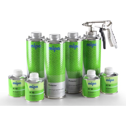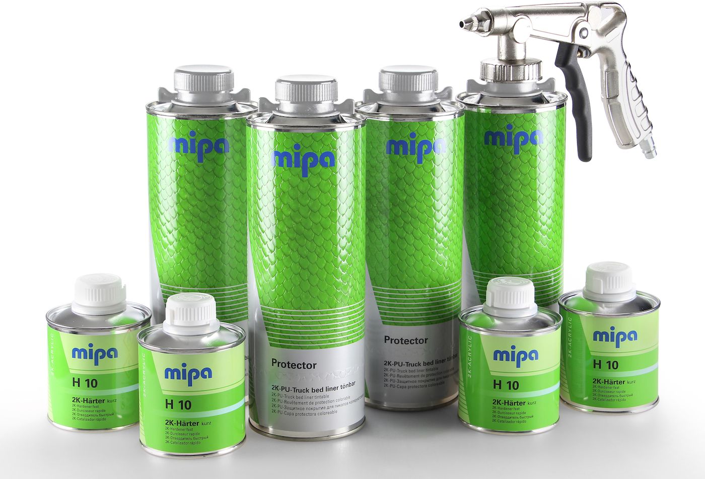 Mipa 2K PU pintamaali Protector setti on tarkoitettu erittäin kovaa kulutusta tarvitseviin pintoihin. Soveltuu avolava-autojen lavojen suojapinnoitukseen sekä erilaisiin lastauspintoihin ja lattioihin tavarakuljetuslaitteissa, alustoihin, runkoihin, tavaratiloihin, astinlautoihin, kansiin niin ajoneuvoissa, teollisuudessa, veneissä kuin muissakin kulutusta vaativissa pinnoissa. Soveltuu myös äänieristystä tarvitseviin kohteisiin. Kestää lämpöä 150 astetta, hetkellisesti jopa 180 astetta. Soveltuu teräs-, sinkki-, alumiini-, puu- sekä lasikuitupinnoille. Sekoitussuhde Mipa H10 ja H5 kovettajilla 3:1 tilavuussuhteessa tai 4:1 painosuhteessa. Käyttövalmis kovetteen lisäyksen jälkeen, erillistä ohennetta ei tarvita. Setissä 4 x 750 ml Protector ja 4 x 250 ml H10 kovettaja sekä levitykseen soveltuva ruisku. Sävytettä sarja sävytettävissä Mipa PMI järjestelmän pastoilla sekä OC, PUR-HS ja BC sävyillä halutun väriseksi. Tuote vaatii sivuilmaruiskuissa 2,5 - 3,0 mm suutinkoon.