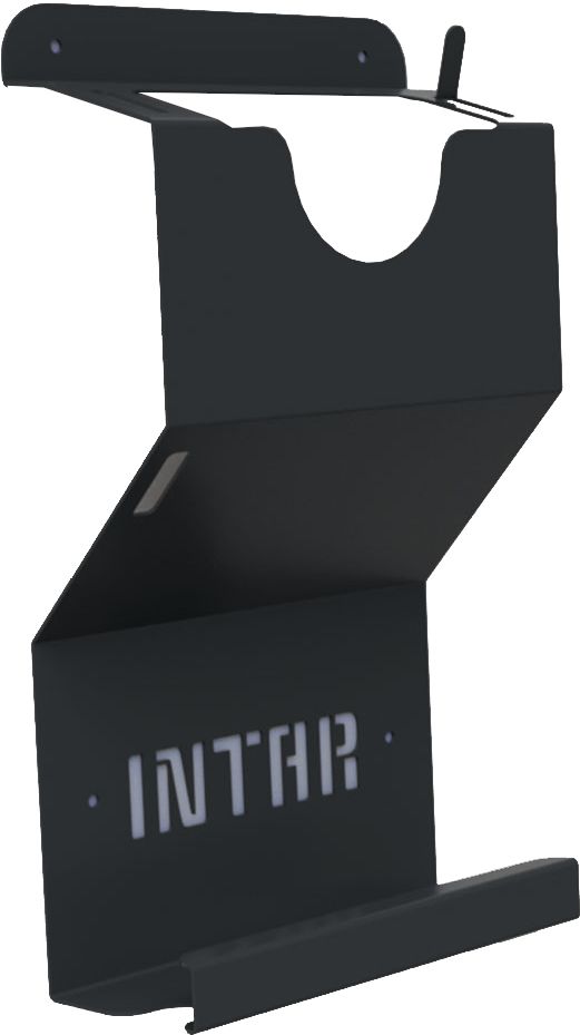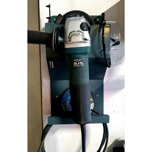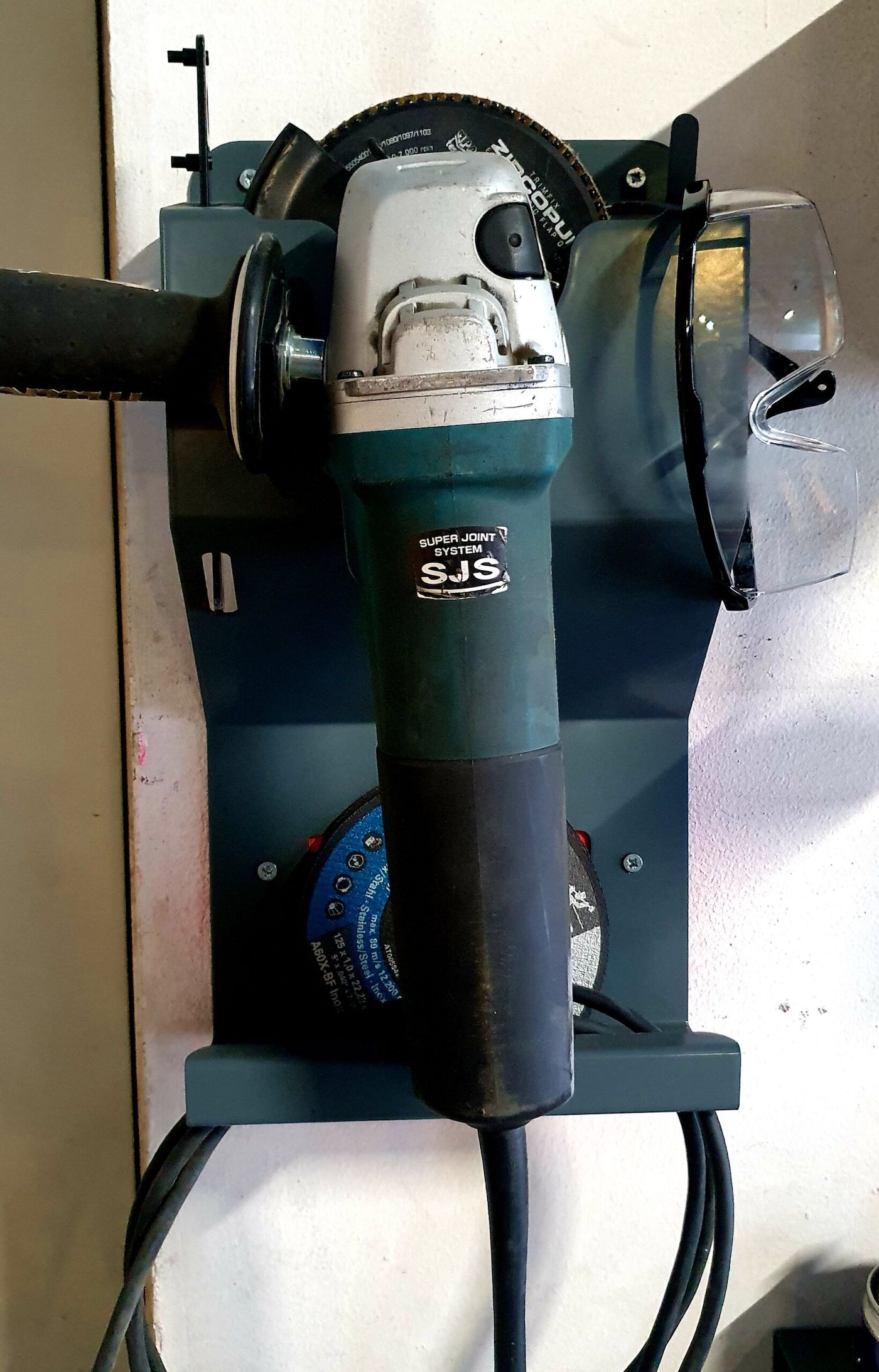 Teline kulmahiomakoneelle. Seinäkiinnitys. Paikka avaimelle, laselle ja laikoille.
