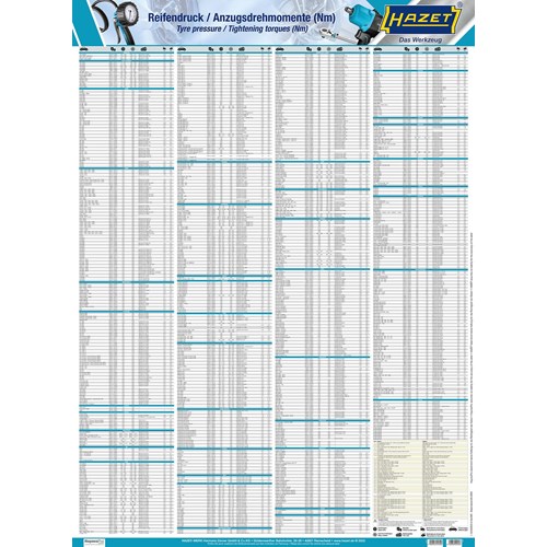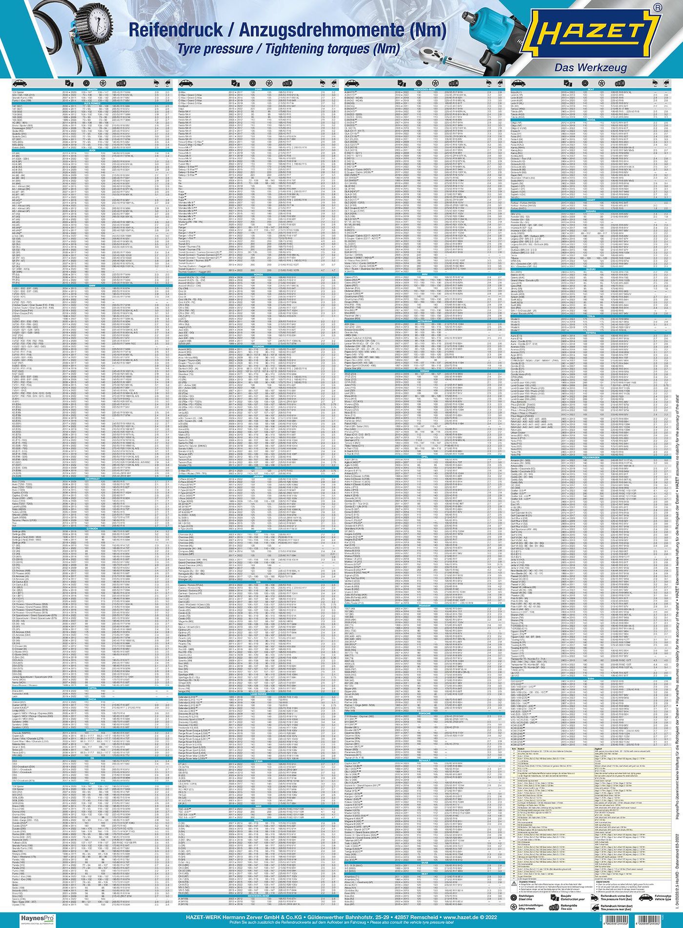 Rengaspaine- ja momenttitaulukko, 710 x 960 mm. Kattaa kaikki yleiset henkilöautomallit (myös sähkö- ja hybridiajoneuvot).