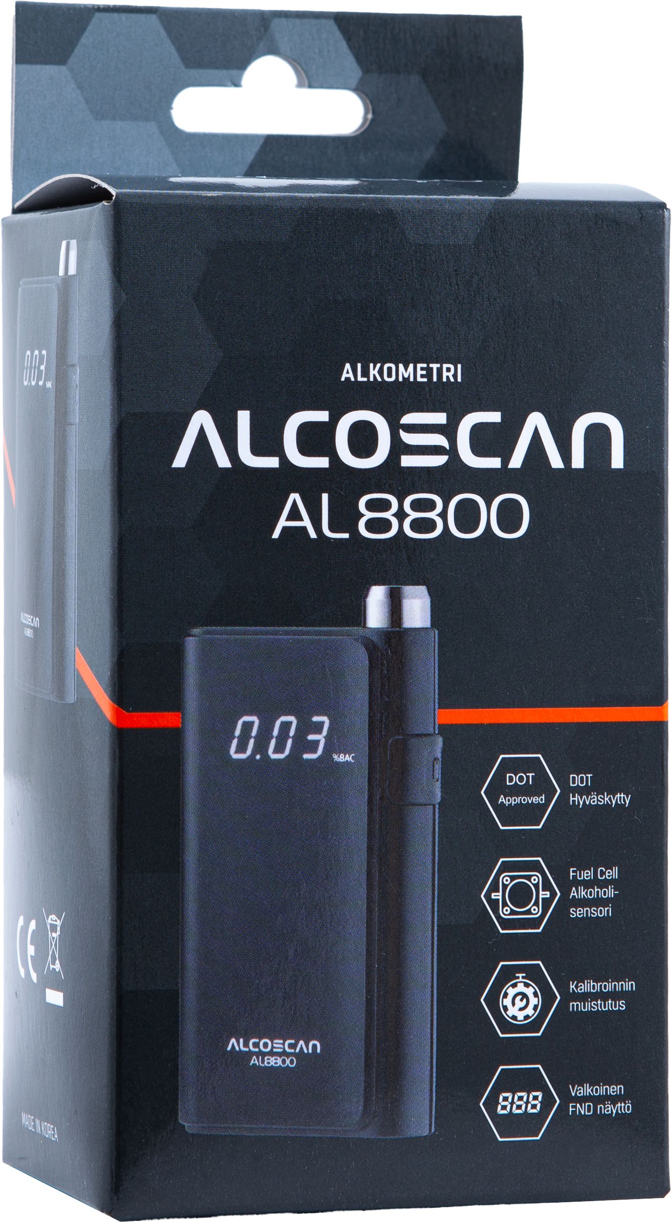 AL8800 on laadukkaalla polttokennosensorilla varustettu alkometri. Laitteessa yhdistyy ammattilaiskäyttöön tarkoitetun laitteen laatu ja luotettavuus sekä kannettavan laitteen helppokäyttöisyys. Alkometriä käytetään yhdellä painikkeella ja siinä käytettävät suukappaleet ovat pestäviä. Tyylikäs alkometri on helppo kuljettaa mukana omassa kotelossaan. Mittausväli on 0,00-4,00‰.