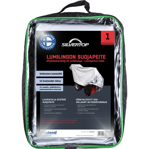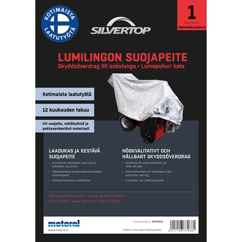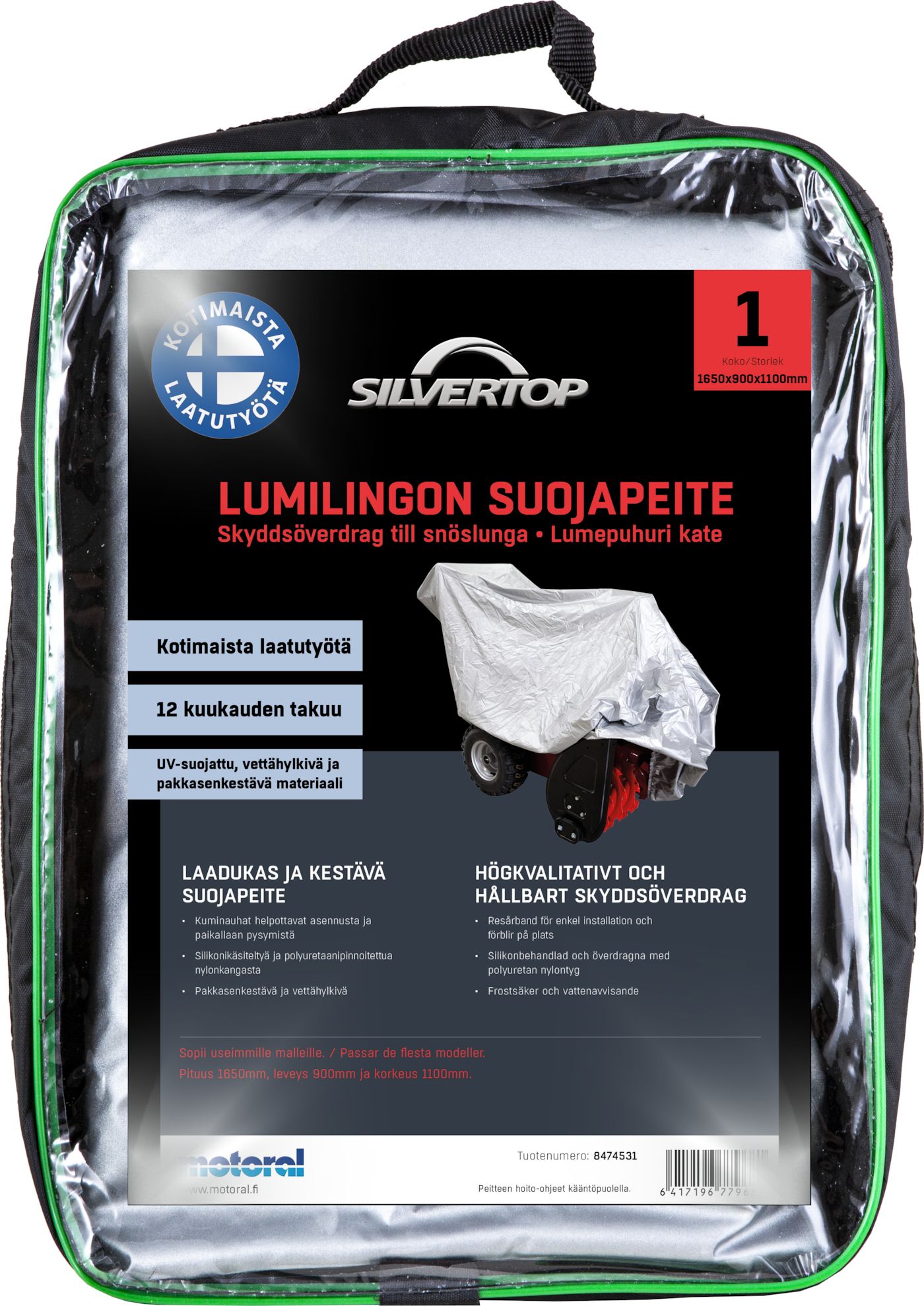 Suomessa valmistettu yleismallinen suojapeite lumilingoille. Helmassa kiertävä kuminauha pitää peitteen paikallaan. Materiaali on pakkasenkestävää ja vettähylkivää silikonikäsiteltyä alumiinikangasta. Peitteen pituus on 1650 mm, leveys 900 mm ja korkeus 1100 mm. Mukana säilytyskassi.