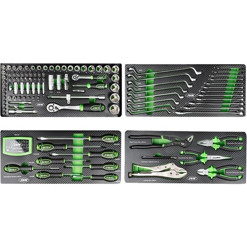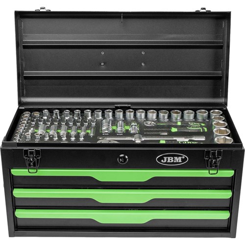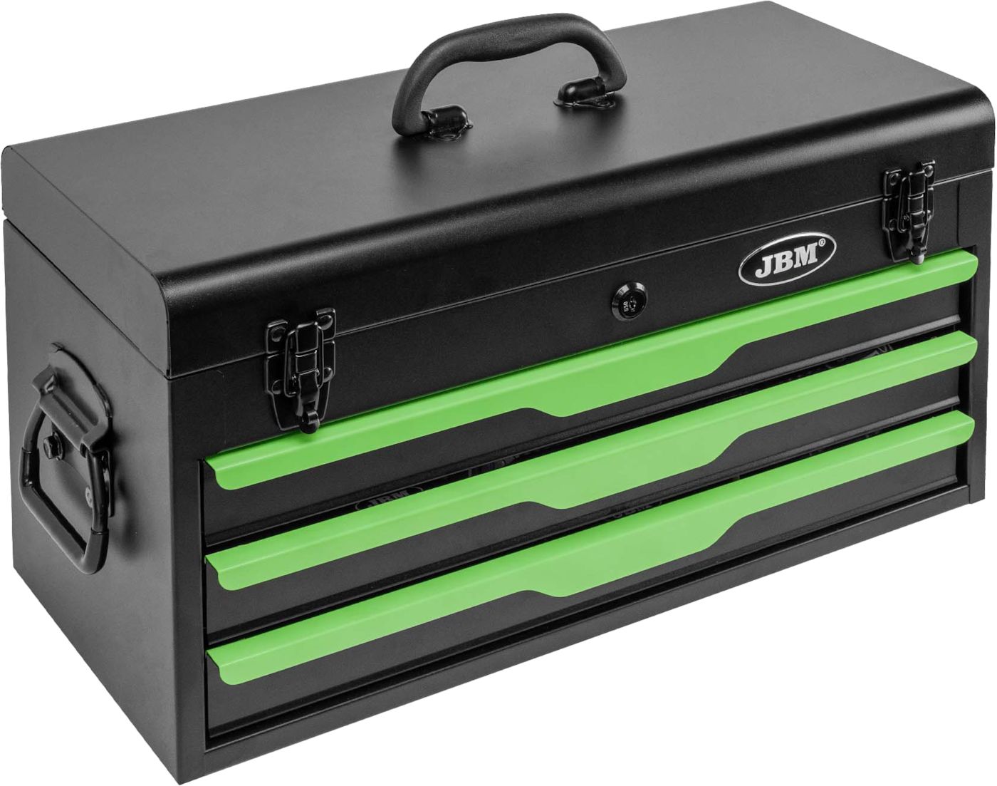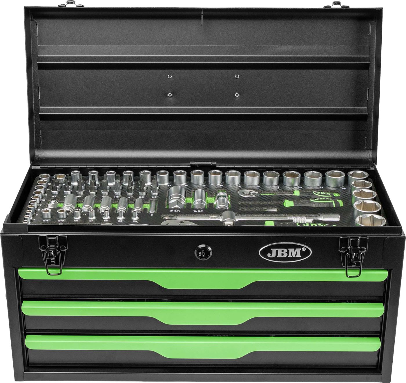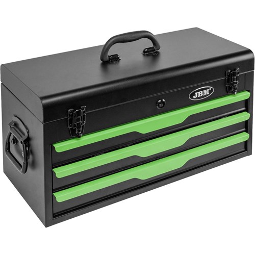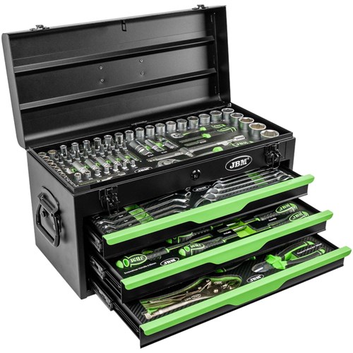Metallinen työkalulaatikko työkaluilla, 143 osaa. Työkalulaatikossa on kolme vetolaatikkoa ja päällä kannellinen laatikko jotka on lukittavissa. Sopii erinomaisesti huoltoautoihin yms. metallirungon ja vetolaatikoiden ansiosta. Mitat ( KxLxS ): 285x535x240mm. Paino 20kg.