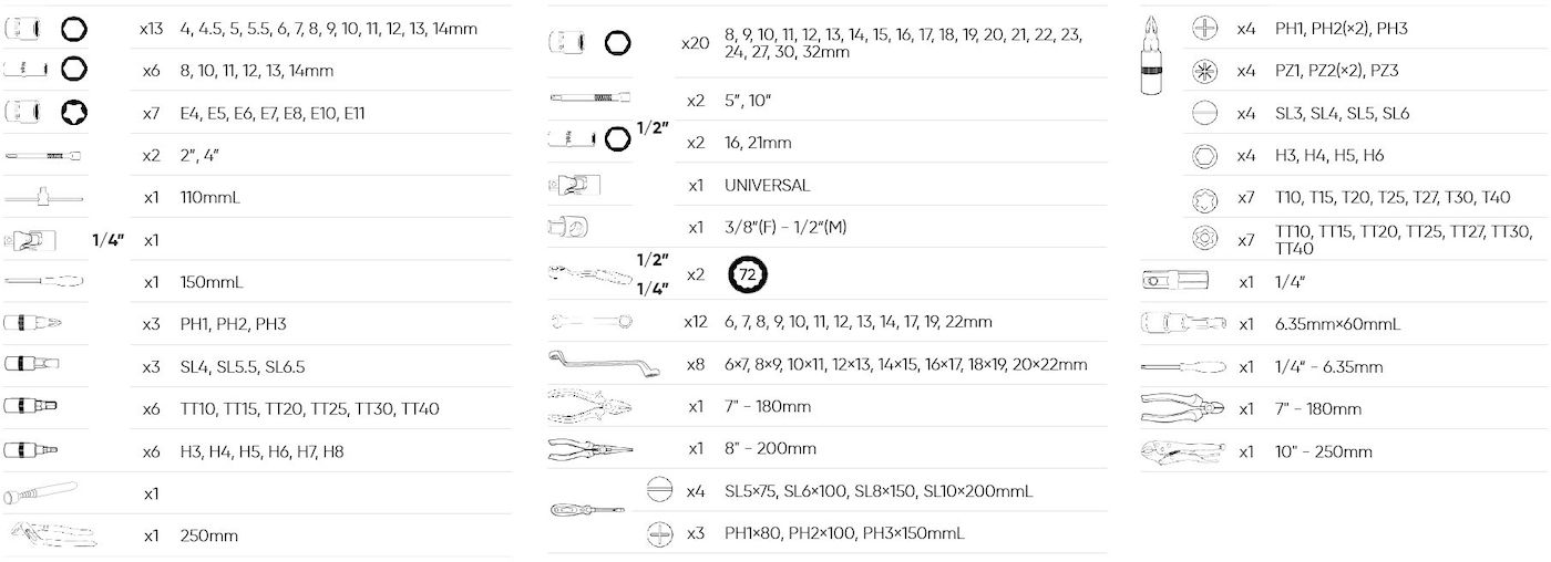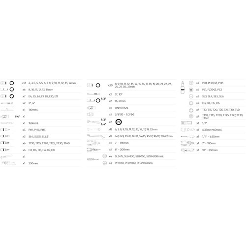 - 1/4" E-torx hylsyt: E4, E5, E6, E7, E8, E10, E11