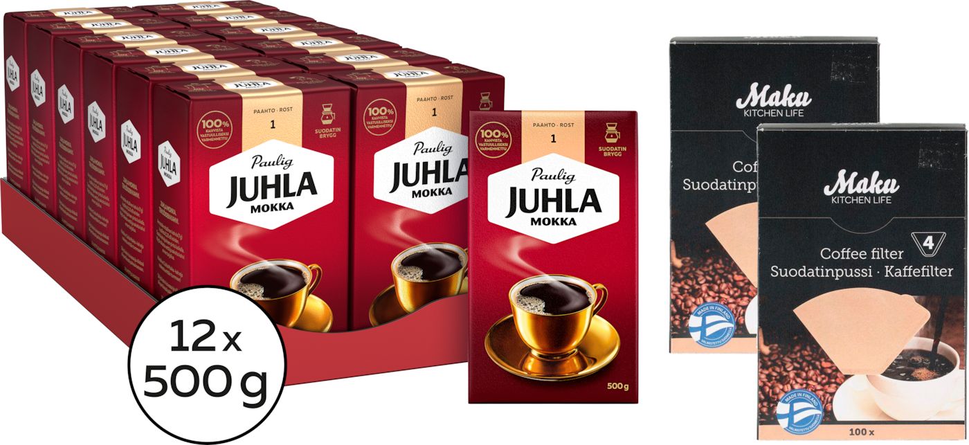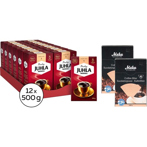 Paulig suodatinkahvi JUHLA MOKKA 500G 12KPL:EEN TUKKUPAKKAUS + KAHVISUODATTIMET