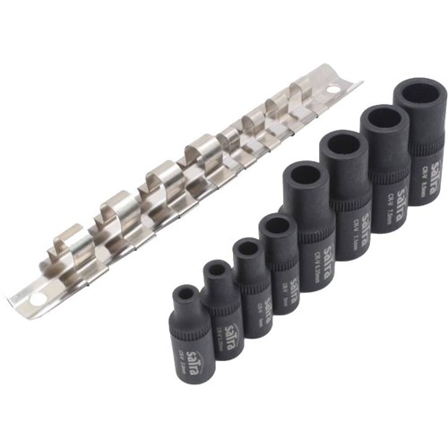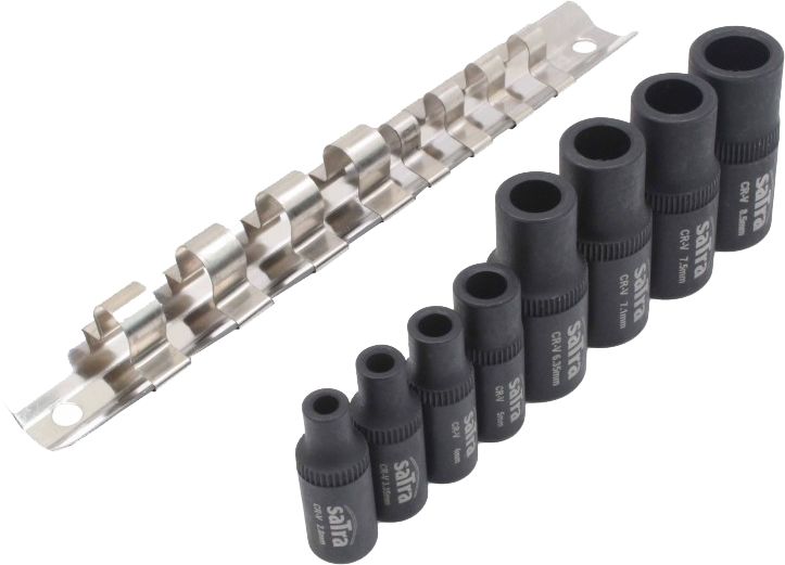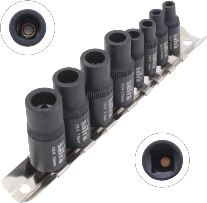 Magneettiset hylsyt kierretappien pitämiseen. Käytetään 3/8" ja 1/4" räikkien kanssa. Hylsyillä pystyttään käyttämään kierretappeja paikoissa jossa T-kahvaa ei voida käyttää. Magneettihylsyt (hylsyn numero vastaa neliön kokoa): 1/4" x 32mmL: #1 (2.8mm), #2 (3.35mm), #3 (4.0mm), #4 (5.0mm). 3/8" x 40mmL #5 (6.35mm), #6 (7.1mm), #7 (7.5mm), #8 (8.5mm).