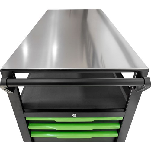 7+4ltk tyhjä työkaluvaunu ruostumattomasta teräksestä valmistettulla työtasolla. Vetolaatikoiden mitat: 7x 569x400x75mm, 4x 569x400x154mm. Mukana 2,5 mm:n laatikkomatot. Pienen laatikon kapasiteetti 35Kg. Suuren laatikon kapasiteetti 40Kg. Vaunu mitat: 1131×720×998 mm.