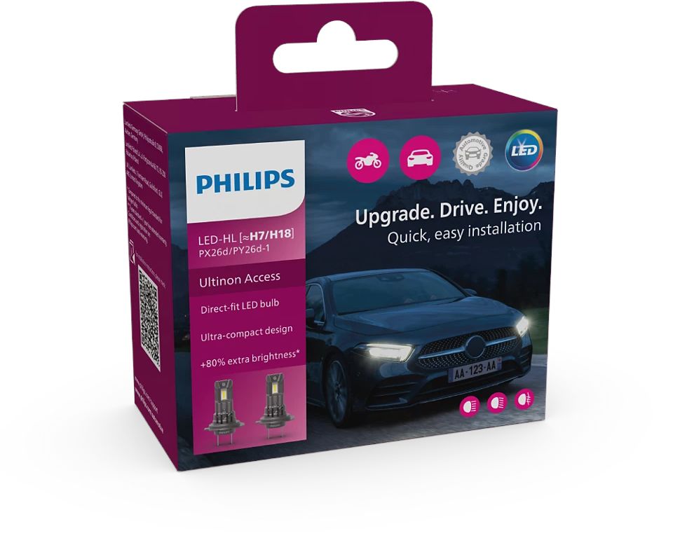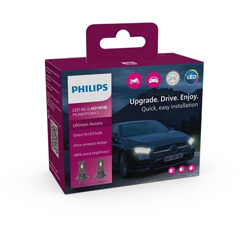 Philips LED Ultinion Access H7 polttimo sopii suoraan halogeeni polttimon tilalle. Polttimon asennus on nopeaa ja helppoa pienikokoisen rungon ja integroidun IEC 60061- standardin mukaisen kannan ansiosta. Pienikokoisissa Philipsin Ultinon Access LED-yleisvaloissa on parempi valoteho kuin halogeenipolttimoissa. LED-tekniikan uusimpien innovaatioiden ansiosta ne tuottavat saman valovirran kuin tavalliset ECE-halogeenipolttimot, mutta parantavat huomattavasti valotehoa ja kuluttavat vähemmän energiaa. Philipsin Ultinon Access LED-polttimot ovat jopa 80 % kirkkaammat* ja ne tehostavat kuljettajien näkyvyyttä tielle, jolloin esteet on helpompi havaita ja ajoturvallisuus paranee. Ei tieliikennekäyttöön.