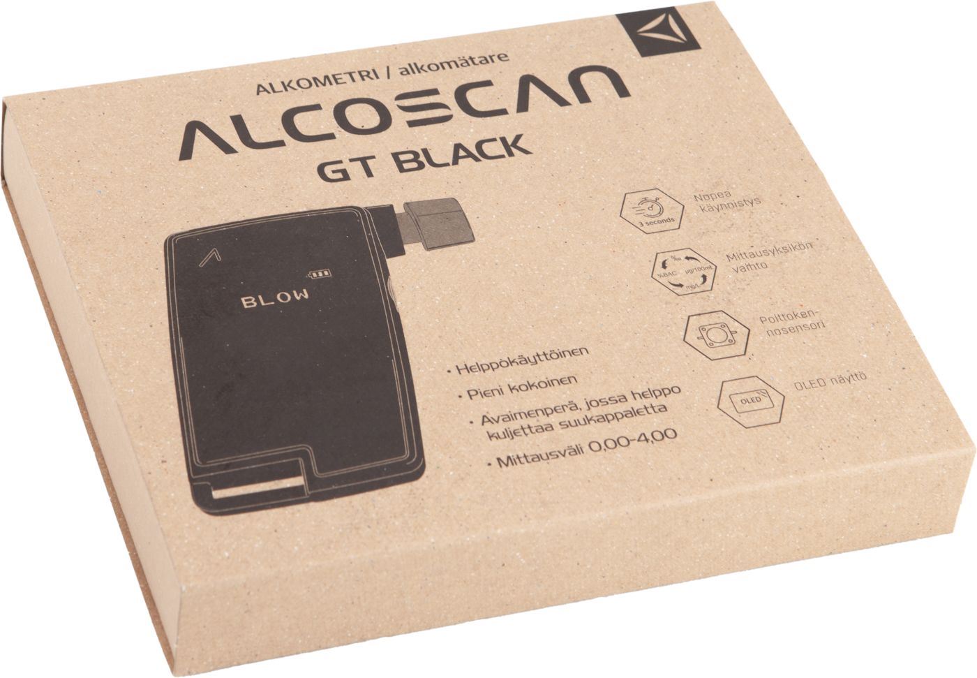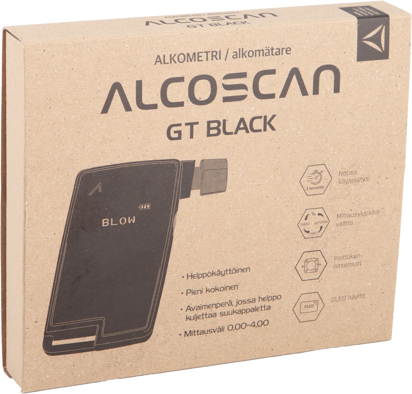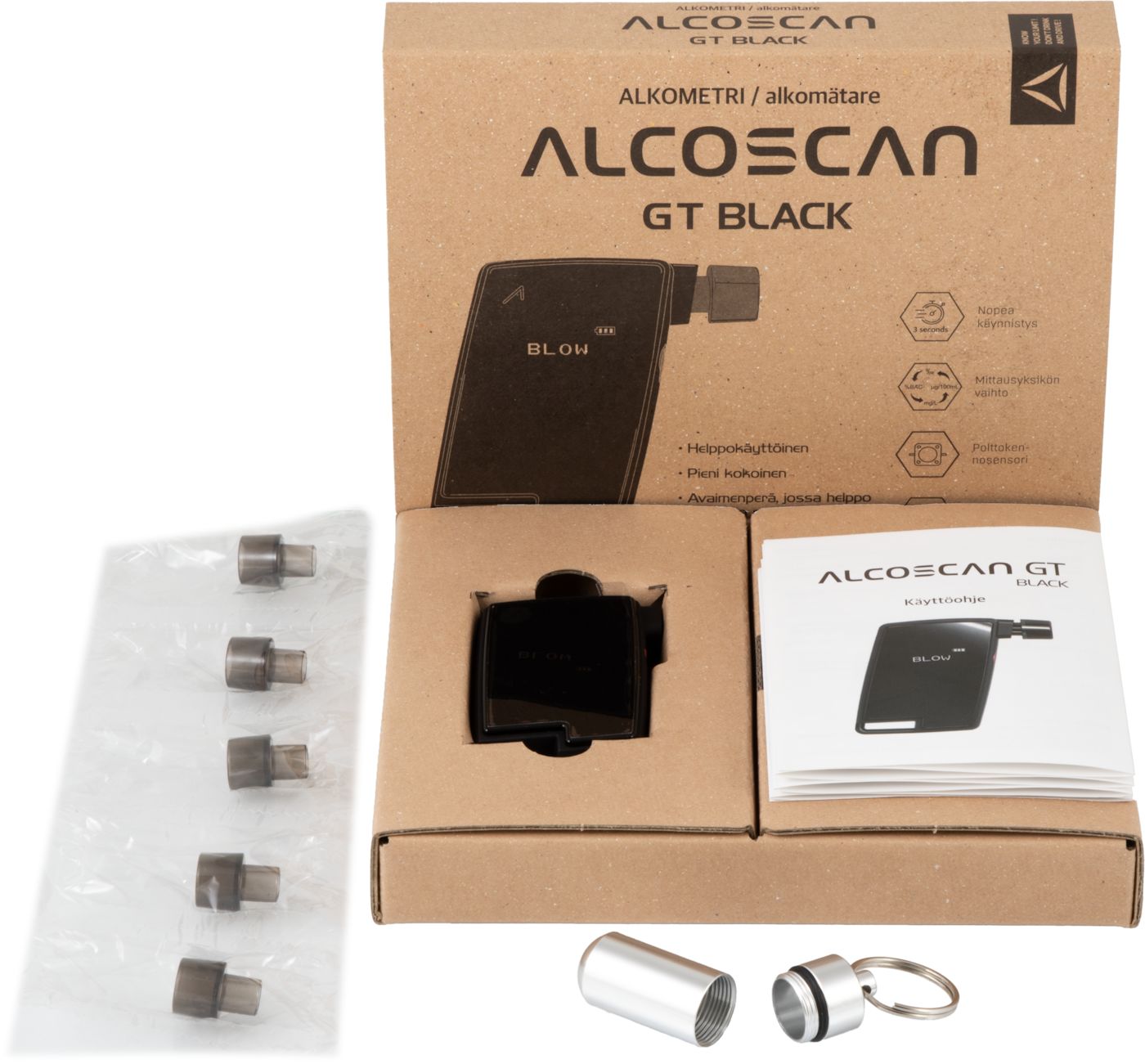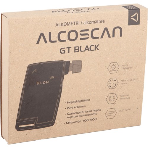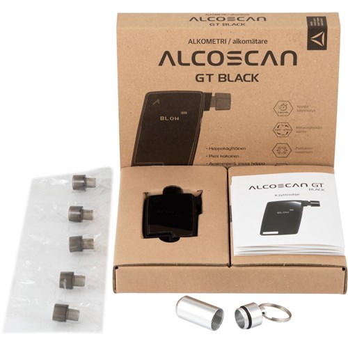 Alcoscan GT on kooltaan pieni ja helppokäyttöinen, laadukkaalla polttokennosensorilla valmistettu alkometri. Laitetta on helppo käyttää ja kuljettaa mukana. Laitteen mukana tulee avaimenperä, jossa voi säilyttää ja kuljettaa suukappaletta. Suukappaleet ovat pestäviä.