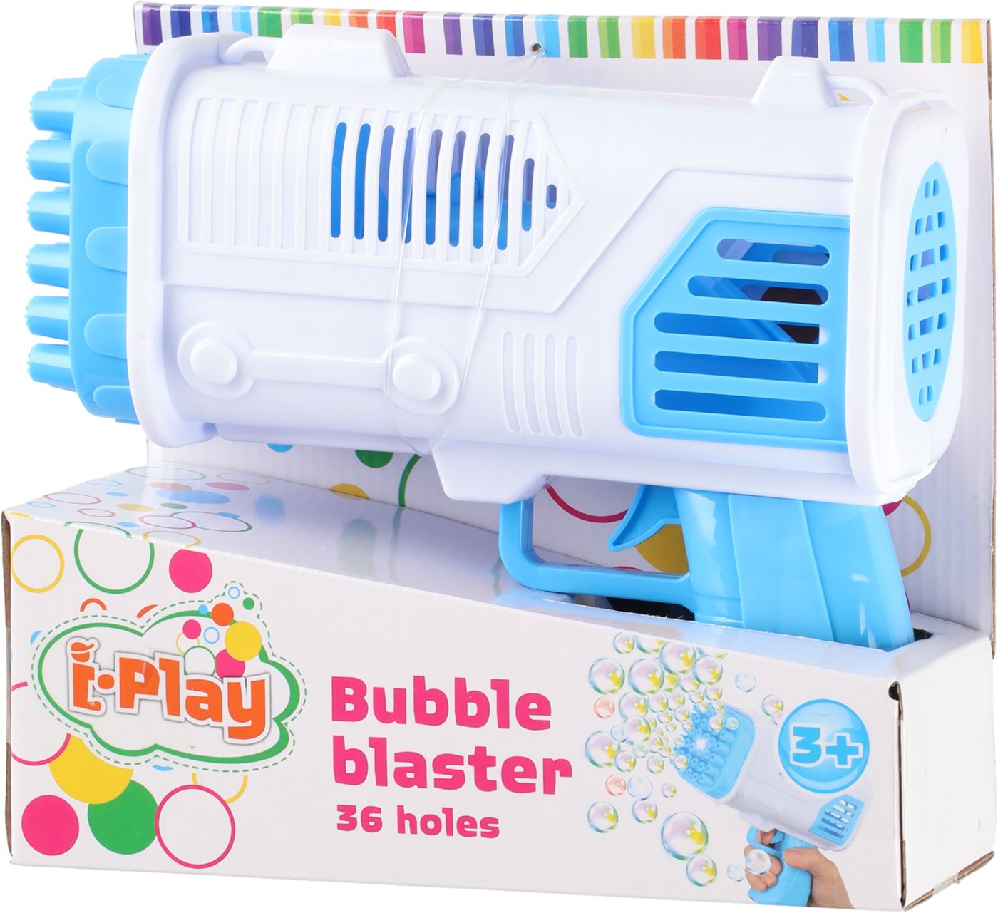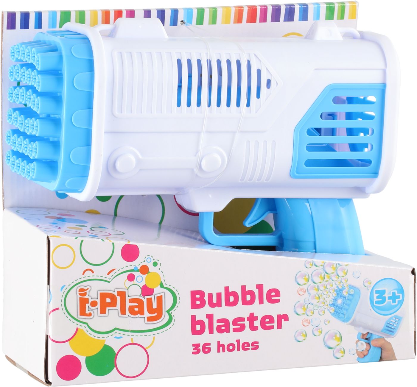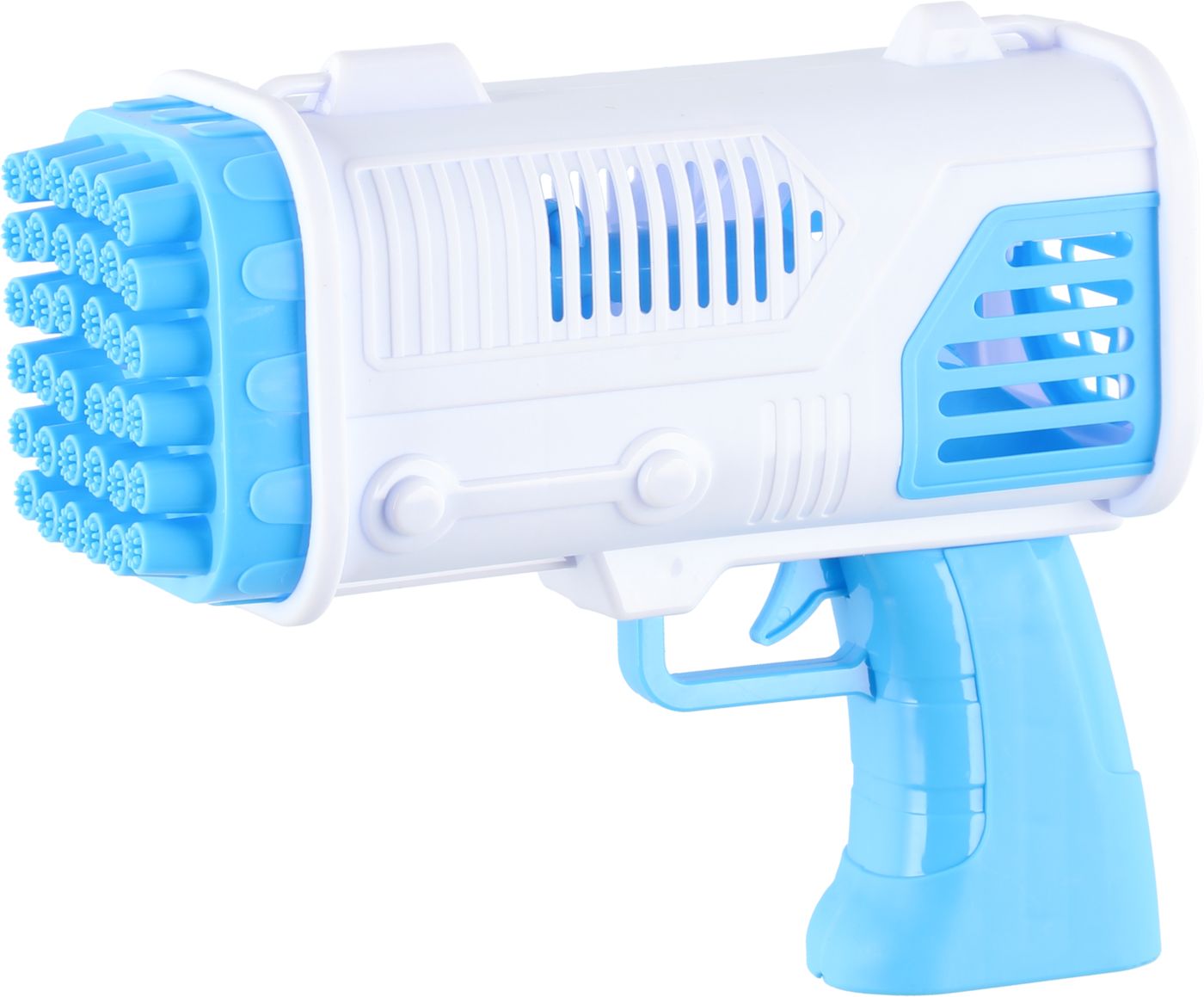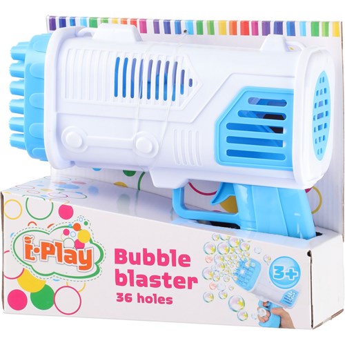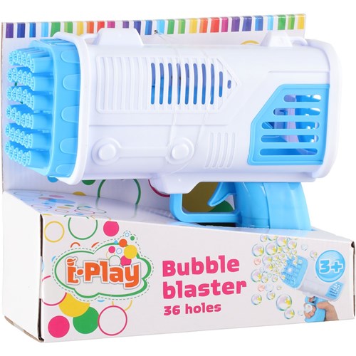 Saippuakuplapyssy 50 ml säiliöllä. Tuote ei sisällä paristoja (tarvitaan 4 kpl AA alkaliparistoja). Pyssyn piipussa on 36 reikää, jossa kuplat muodostuvat.