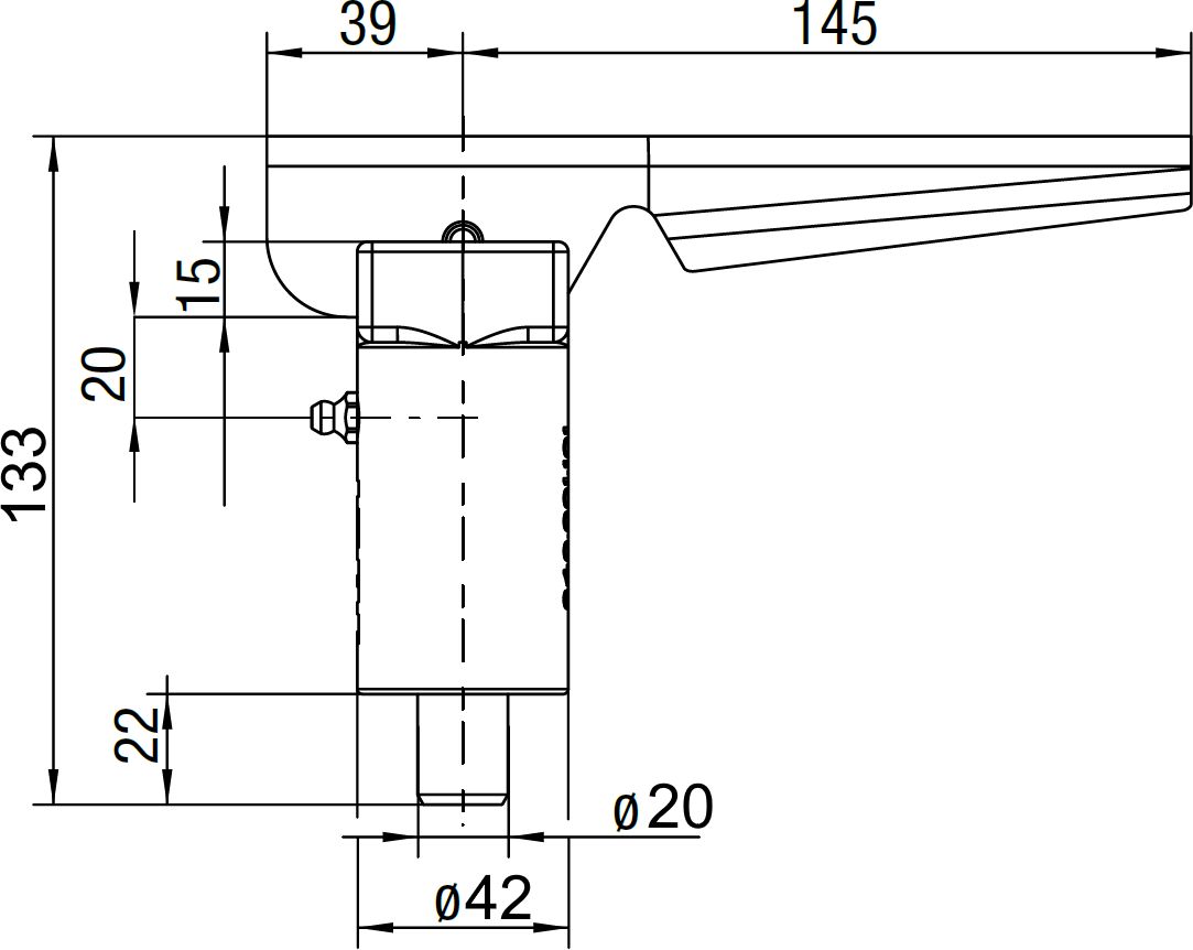 Teräsrunkoinen jousikuormitettu lukituskahva rasvanipalla. Kahva, tappi ja jousi galvanoitua terästä.