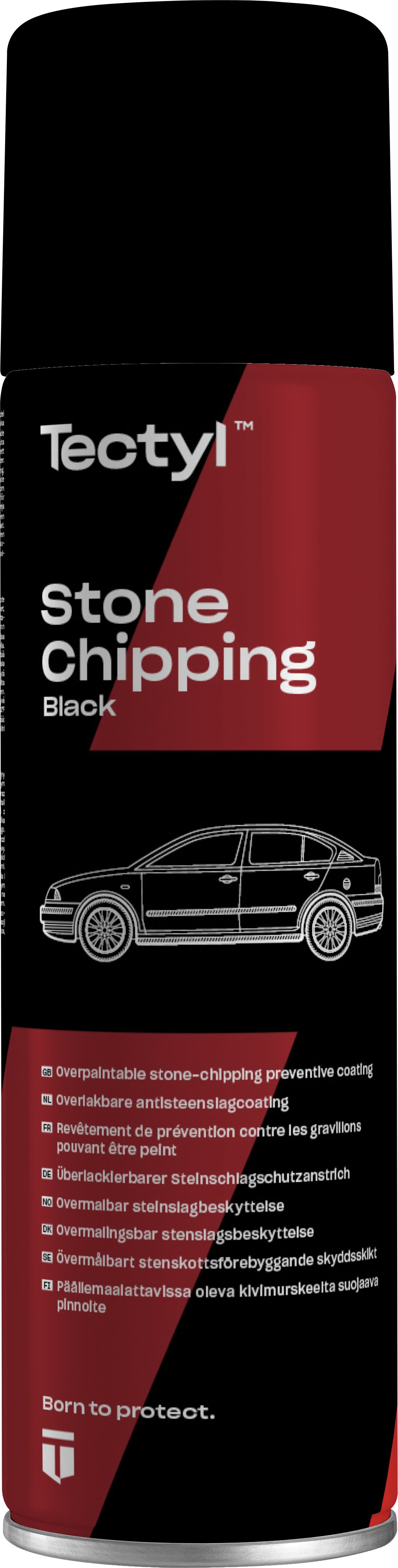 Tectyl Stone Chipping Black on liuotinpohjainen, kumi-/hartsipohjainen, musta korroosionestoaine, jota suositellaan käytettäväksi korroosioneston lisäksi rautametallien hankausvaurioiden ehkäisemiseksi sekä ajoneuvojen, kuorma-autojen ja perävaunujen alustan suojaukseen. Muodostaa kuivuessaan lujan, mustan, kestävän ja sitkeän kalvon. Tuotetta voidaan käyttää myös ääneneristysmassana ja sen yli/päälle voi maalata. Kuivuu erittäin nopeasti. Käyttökohteina esimerkiksi ajoneuvon kiveniskuille alttiit osat, kuten kynnyskoteloiden ulkopinnat, lokasuojan ulkonevat kaariosat sekä etu- ja takahelmapellit. Arvioitu suojauksenkestoaika: Ulkotiloissa 21 kuukautta. Varastointi: Varastointilämpötila +10...+35°C. Kevyt sekoittaminen suositeltavaa ennen käyttöä. Oikein varastoituna säilyttää parhaan suorituskyvyn 36 kuukautta valmistuspäivämäärästä. Pinnan esikäsittely: Tuotteen suurin teho saavutetaan, kun suojattava metallipinta on puhdas, ruosteeton, pölytön ja kuiva. Käyttö: Tuote on käyttövalmis, käyttöympäristön ja tuotteen lämpötilaksi suositellaan +10...+35°C. Ylimaalatessa suojakalvon tulee olla täysin kuiva. Kaksikomponenttimaaleja käytettäessä levitä ensin ohut kerros pohjamaalia/primeria ja riittävän kuivumisajan jälkeen kaksikomponenttimaali. Teoreettinen riitto: 1,4 m²/ltr. Kosketuskuiva @ 20°C: 45 min. Kovettumisaika @ 20°C: 2-3 tuntia. Kuivakalvon suosituspaksuus metallipinnalla: 250 mikronia.